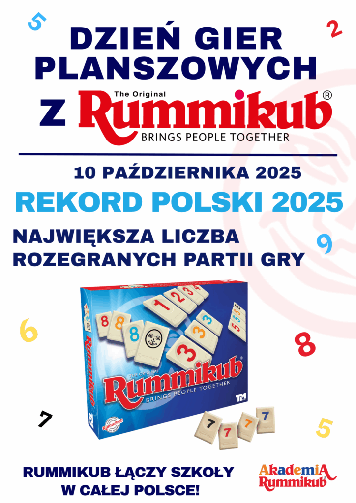 W tym roku szkolnym przystąpiliśmy do programu „Rummikub w szkole” (jego koordynatorką jest pani Anna Mietelska) i w związku z tym 10 października, podczas Dnia Gier Planszowych, dołączamy do ogólnopolskiej inicjatywy organizowanej przez Akademię Rummikub i bierzemy udział w próbie bicia Rekordu Polski w liczbie rozegranych partii Rummikub!